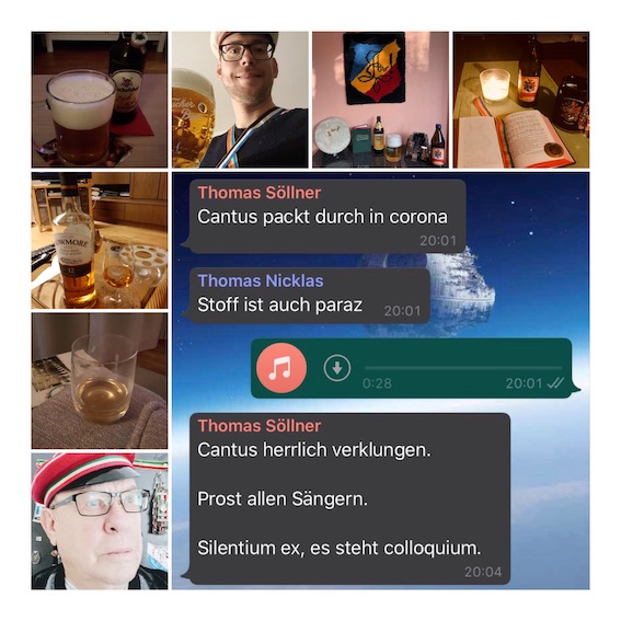 Besonders gefreut hat uns, dass unser etatmäßiger Bierorgler Bb Hans Kuchenreuther zur Verstärkung des Kneipgefühls die von ihm eingespielten Cantus „gaudeamus igitur“ und „O alte Burschenherrlichkeit“ als mp3-Dateien verteilte.