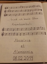Am 08.02.2019 gaben sich die Farbenbrüder der Alemannia und Absolvia die Ehre und schlugen gemeinsam die schon traditionell stattfindende Krambambulikreuzkneipe. 27 Farbenträger und 3 Gäste fanden sich daher bis 20Uhr in den Räumlichkeiten unserer Freundschaftsverbindung Absolvia Fürth ein. Mit voller Vorfreude auf den bevorstehenden Krambambuli kamen nicht nur Alemannen und Absolven, sondern auch Vertreter einer Akademischen Verbindung Landsmannschaft Onoldia Aldorf, Vertreter der Erlanger Wingolf und Vertreter der Arminia Bamberg und Bavaria Nürnberg. Pünktlich um 20Uhr schlugen Farbenbruder Lotta und Bundesbruder Schnapp die Kneipe an und führten mit treffenden Worten durch einen kurzen und knackigen offiziellen Teil, nur um im unmittelbaren Anschluss daran den Exteil der Kneipe zu übernehmen. In diesem wurde der von Bundesbruder Schenk und Farbenbruder Gorbi zubereitete Krambambuli kredenzt – da bleibt nur zu sagen: Welch Wohlgenuss!